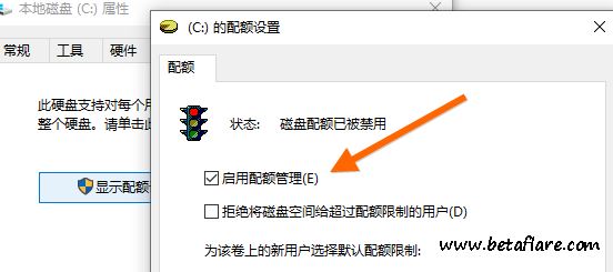 3、 在弹出的“配额设置”中,勾选“启用配额管理”并确定,然后点击应用并确定即可。