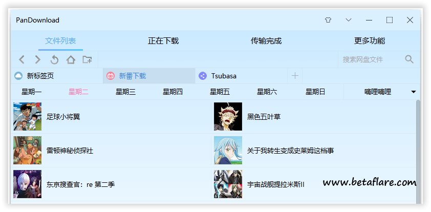 除了常见的离线下载,资源搜索(搜索全网网盘资源)外,Pandownload还有新番批量下载的功能。在“更多功能”选项里点开可以找到,支持比例bilibili和ace动漫。