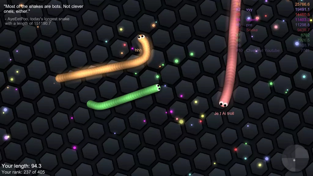 slither.io跟贪吃蛇游戏类似,只是现在换成虫子了。它是一款在线网络游戏,同时有android版本,游戏界面蛮精致的。在游戏里玩家吃掉途中的所有彩色小球。想要吃掉大量小球可不容易,因为,你还要对抗一群同样在努力吃掉小球的虫子(其它在线玩家)。
