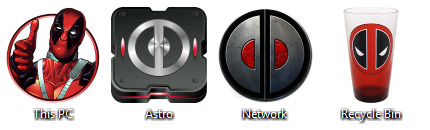 《死侍》主题包还包括修改过的桌面图标,如下所示。 Deadpool竖起大拇指作为“我的电脑”图标,“用户”则是Deadpool磁盘,Deadpool的皮带扣用于“网络”图标“,”回收站“图标则是Deadpool血腥杯。