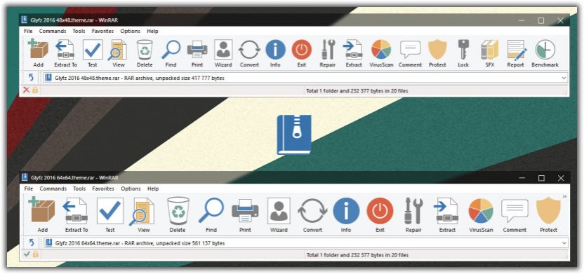 Glyfz 2016 WinRAR theme,基于清晰简约扁平化图标的WinRAR主题。 图标尺寸包含:48×48,64×64。