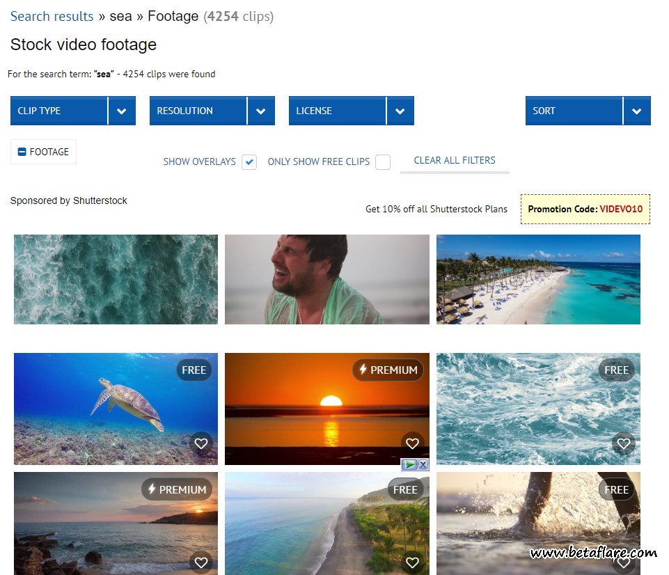 2、然后网站会列出搜索结果,可以通过“Clip Type”剪辑类型,“resolution”分辨率,”License”许可方式,“Sort”排序 来筛选。另外勾选“ONLY SHOW FREE CLIPS”。这样搜索出来的都是免费的影片素材了。