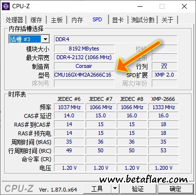 切换到spd页,可以查看当前电脑所有插槽的真实内存型号信息,与买回来的内存信息相比对是否是正品的内存。