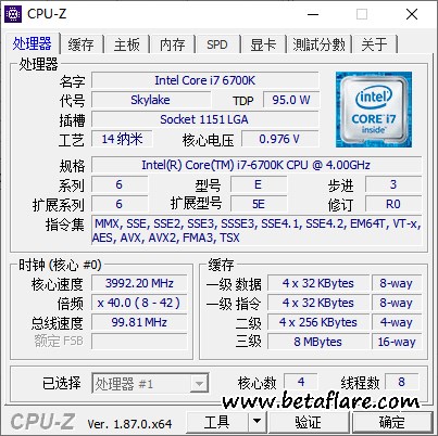 在处理器页面,可以查看当前电脑的CPU的完整信息,包括工艺,核心电压等等。