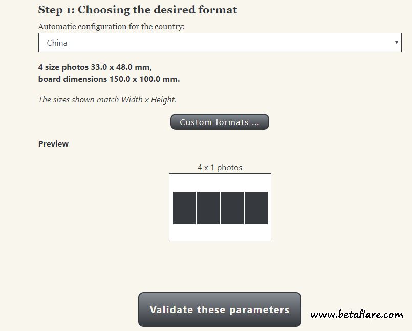 2、再点击「Custom formats」钮,网页会自动选定国家。设定大头照的尺寸大小。二寸大头照的尺寸,为3.3cm×4.8cm。