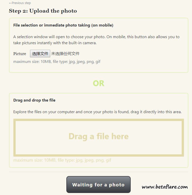 4、上传完毕之后,点击「Waiting For a photo」,「Next」。生成护照照片后,可以再调整照片的位置,让大头照在它的区域范围中。