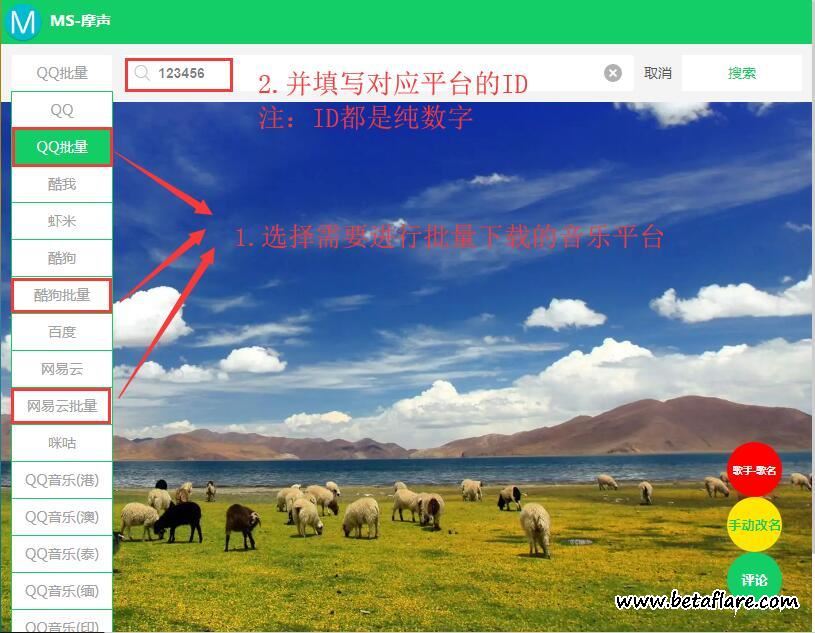 摩声网站还支持音乐批量下载功能,在左侧选择带“批量”字样的音乐平台。在搜索框输入平台ID,都是纯数字的。