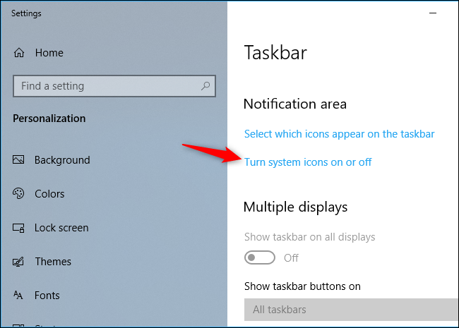 在出现的“设置”窗口中向下滚动,然后单击“通知”区域下的“打开或关闭系统图标”。