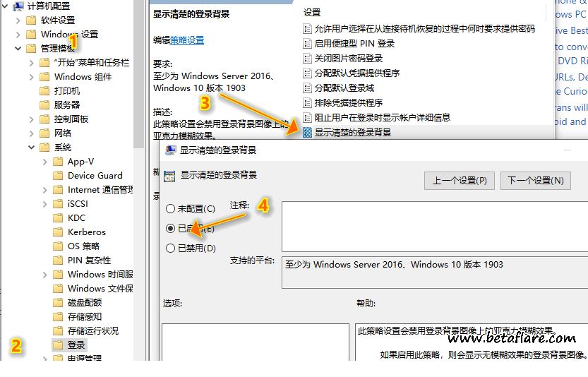 默认值为“未配置”。如果禁用或未配置此策略,则登录背景图像将采用亚克力模糊效果。选择已启用,则会显示无模糊效果的登录背景图像。