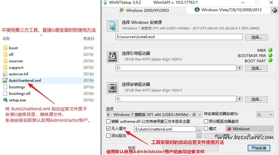 12、增加自动应答文件(压缩包文件夹内2个xml文件可选),减少安装步骤,默认的自动应答文件为新建本地用户,可选默认启用Administrator账户直接登录的XML文件替换后安装(密码默认为空);