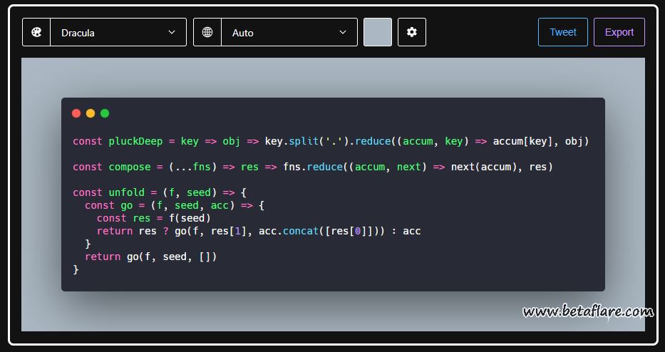 Carbon 是一个代码截图生成器,通过设置窗口颜色和语言类型就可以导出图片,也可以自定义代码字体和背景色,支持近 30 种主题色和几乎所有主流语言,用于分享时更加美观。