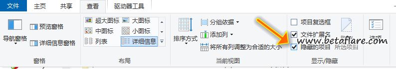 打开文件资源管理器,在视图下,勾选“隐藏的项目”和“文件扩展名”选项。