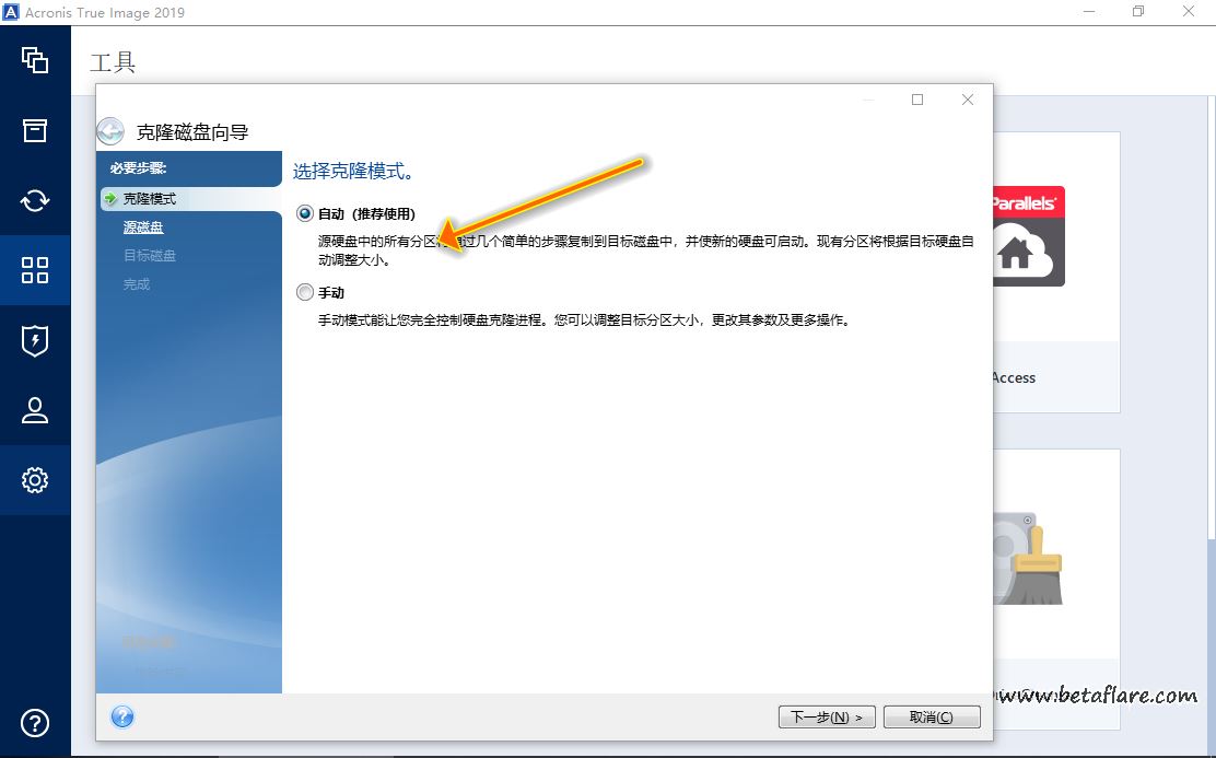 2、「克隆模式」选择“自动”,目标磁盘的分区大小和源磁盘一致,点击「下一步」。