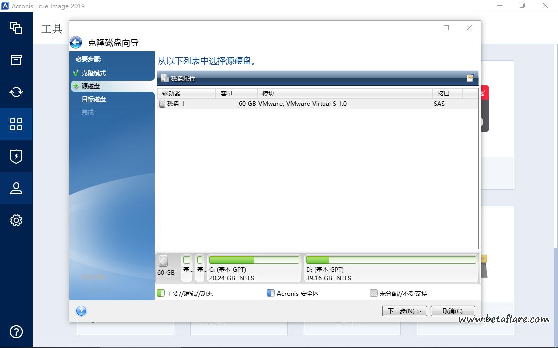 3、选择来源磁盘,即「磁盘1」点选「下一步」。