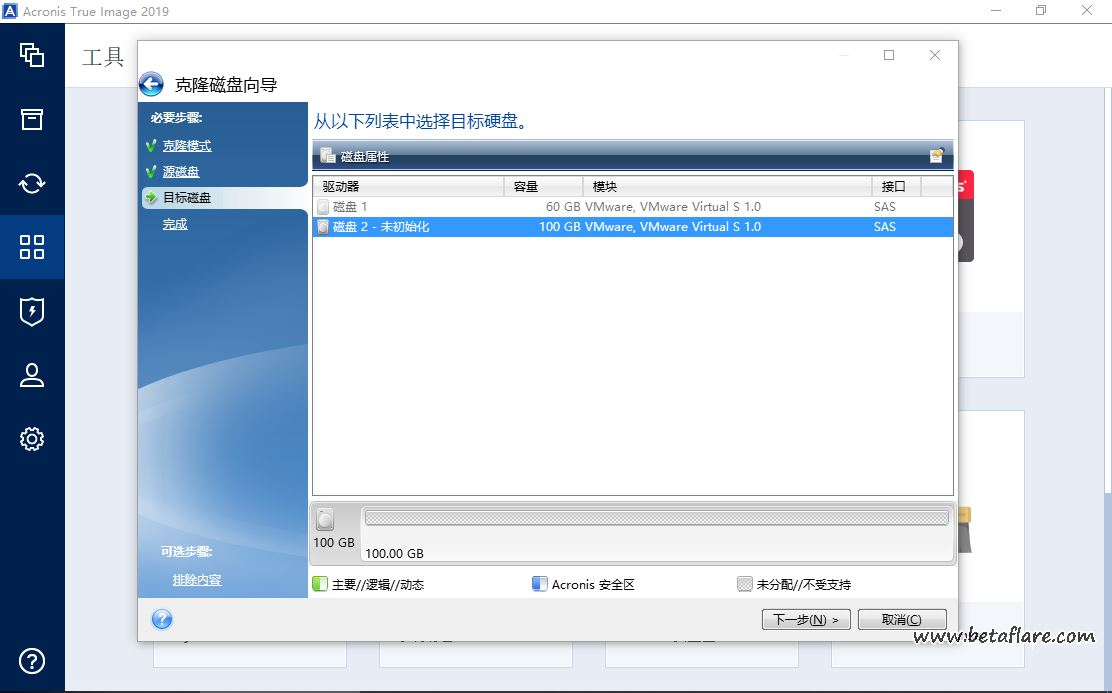 4、选择「目标磁盘」为「磁盘2」,点击「下一步」。