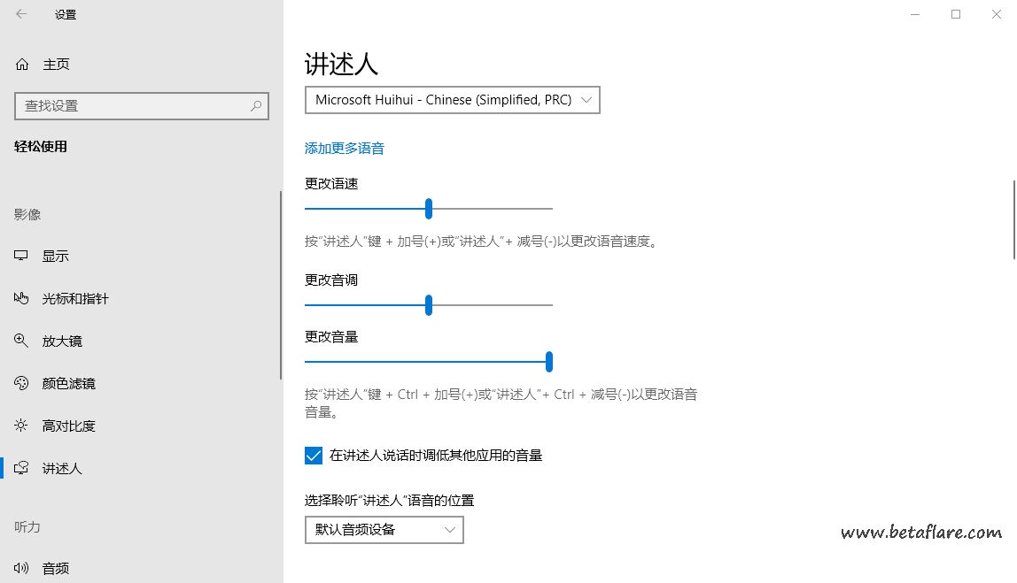 此处的设置允许您配置的讲述人声音选项。 您可以更改默认声音、语速、音调和音量。 这里还可以设置「在讲述人说话时调低其他应用的音量」。