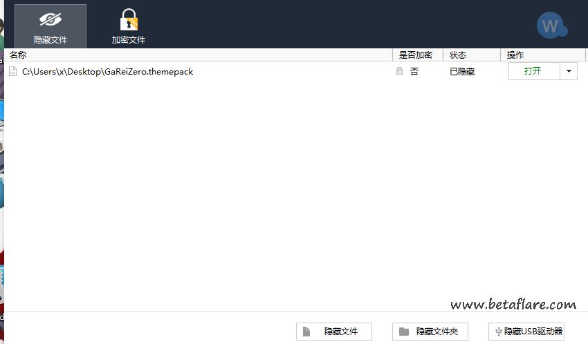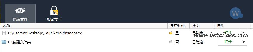 在WiseFolderHider主界面上显示,这里在桌面隐藏了一个文件GaReiZero.themepack,在C盘根目录隐藏了文件夹「新建文件夹」。