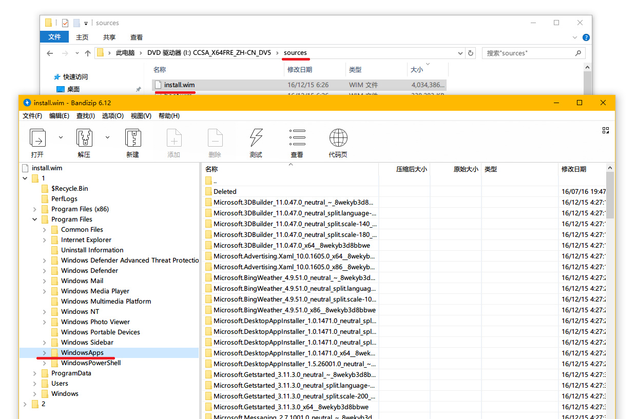 打开镜像,进入 sources 文件夹,找到 install.wim 文件,用压缩软件打开。