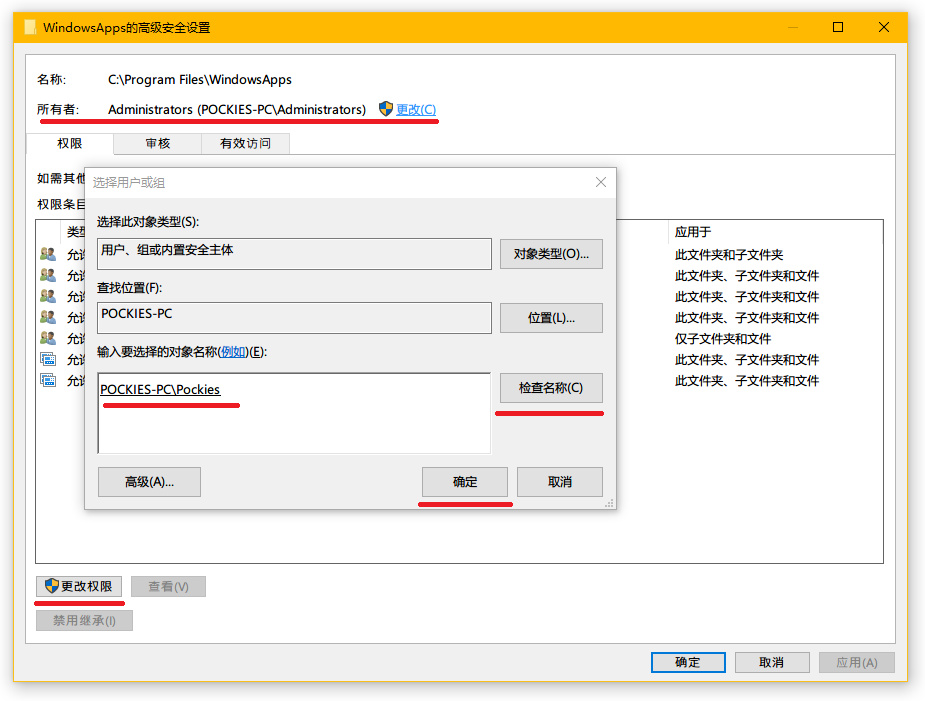在弹出窗口的“对象名称”白框内输入你的用户名(比如我的用户名是pockies),点击“检查名称”自动补全对象名称,随后一路确定直到属性窗口关闭。