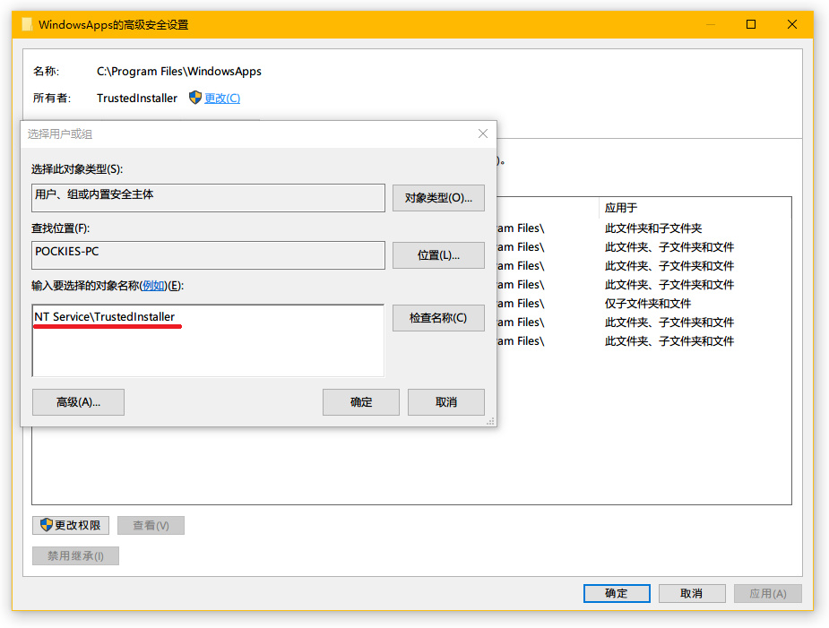再次右键属性进入 WindowsApps 的高级安全设置,修改所有者为 NT Service\TrustedInstaller,检查名称→确定。