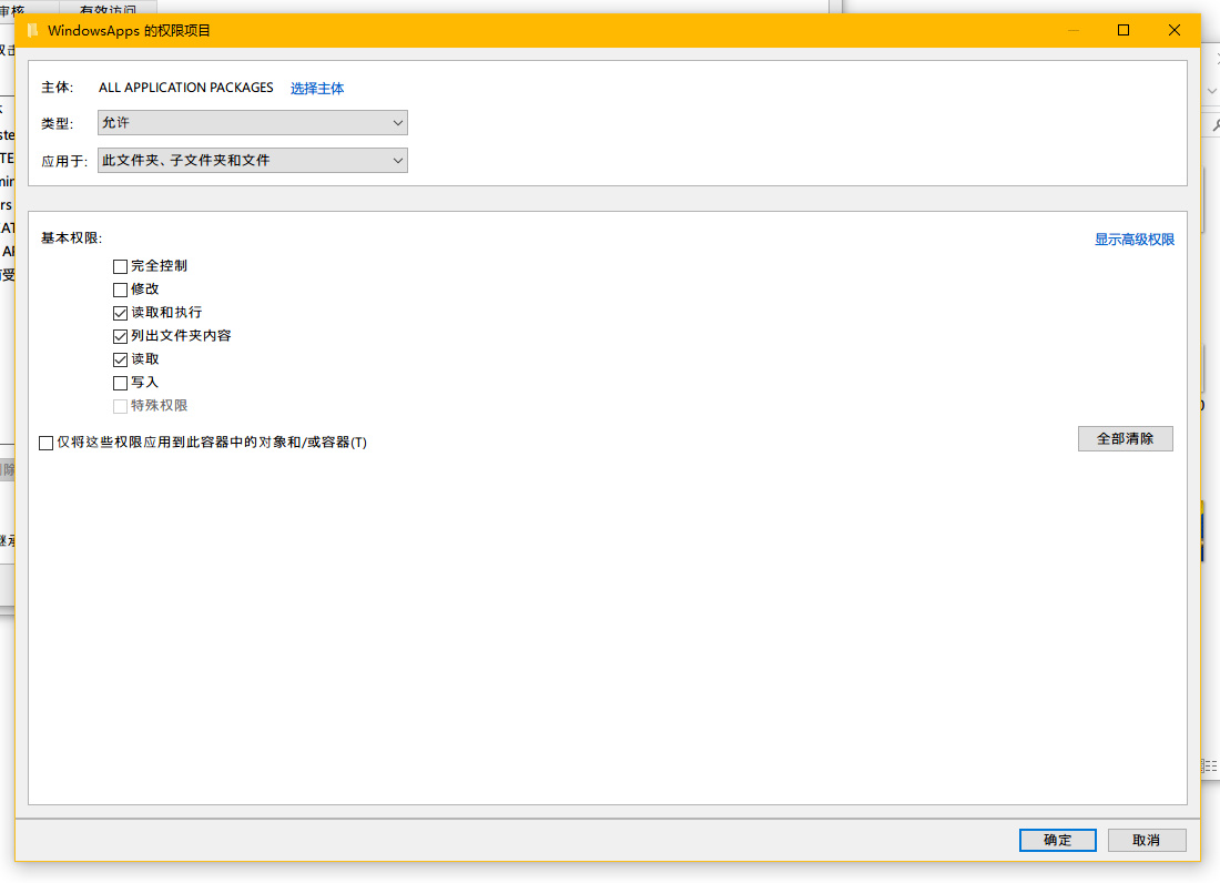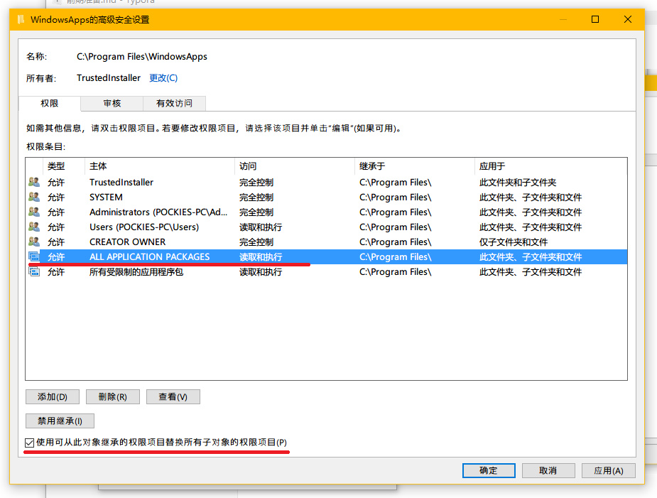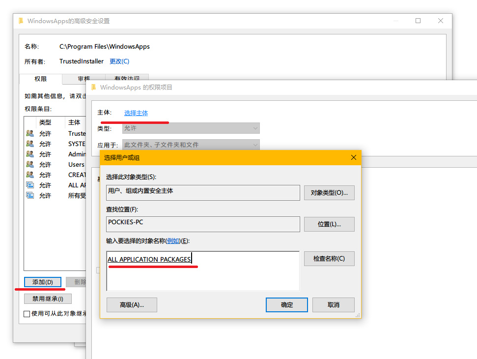 回到高级安全设置,点击左下角的 添加→选择主体,输入 All Application Packages ,检查名称→确定。