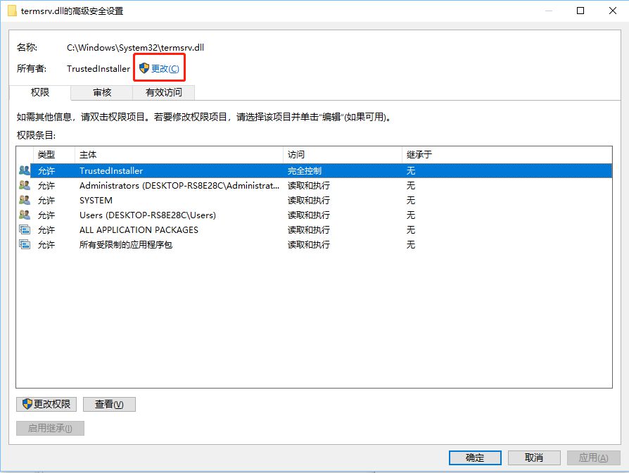- 在弹出的窗口中,会显示当前文件的所有者为TrustedInstaller, 点击后面的更改,弹出选择用户和组的窗口。