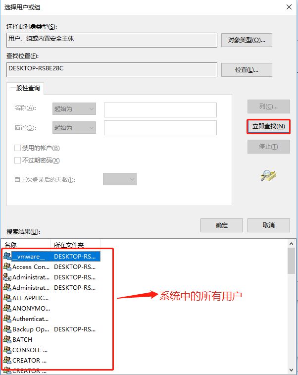 - 如果不记得用户名称,可以点击高级按钮,然后点击立即查找,可以将系统中的所有用户和组显示出来,选择需要的用户即可。