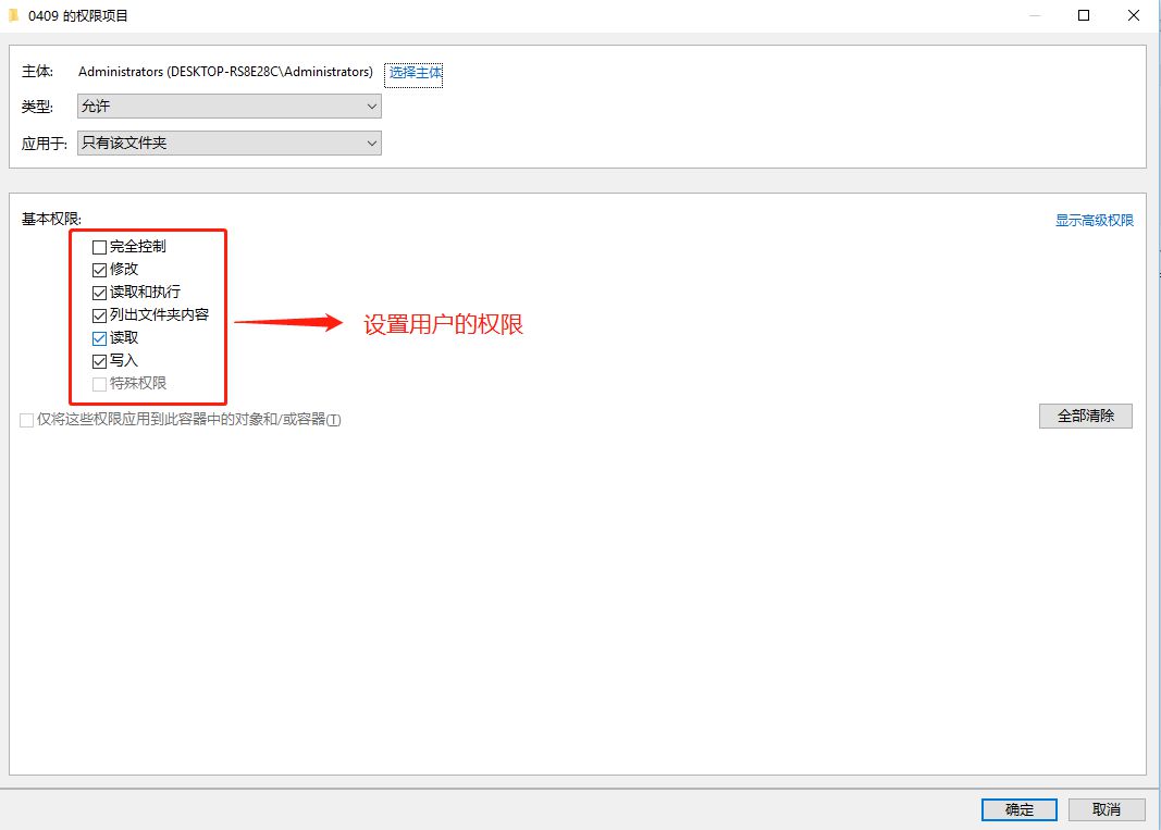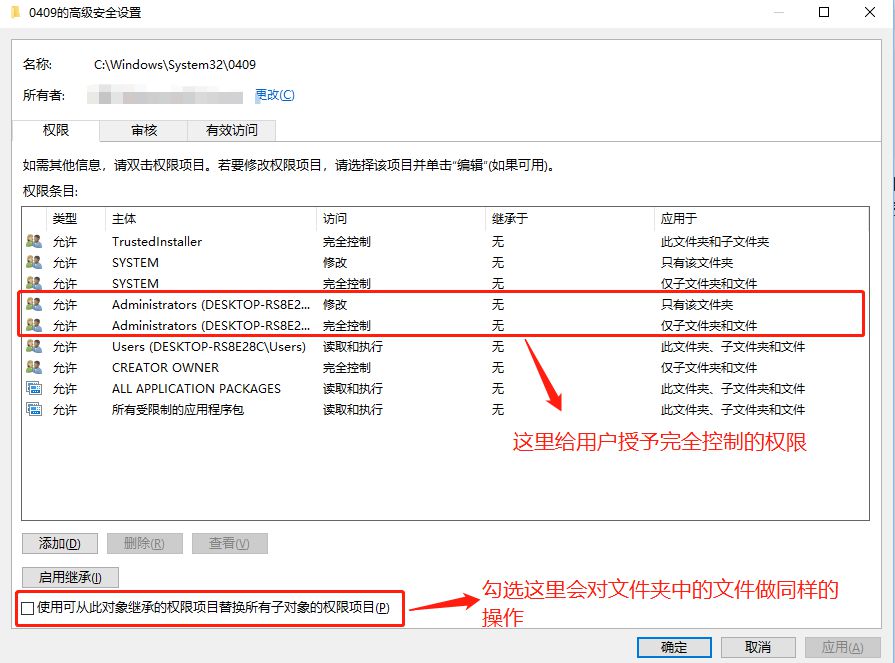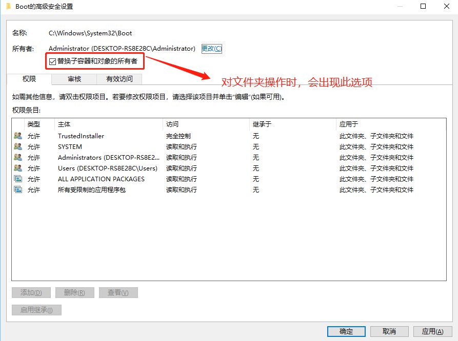 - 如果是对文件夹操作,会出现左下角的复选框,在窗口中的左下角的方框中打勾。如果Administrators的权限是