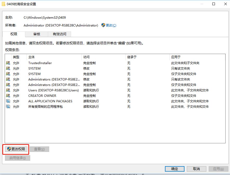 高级按钮 , 重新打开高级安全设置窗口,点击左下角的更改权限按钮