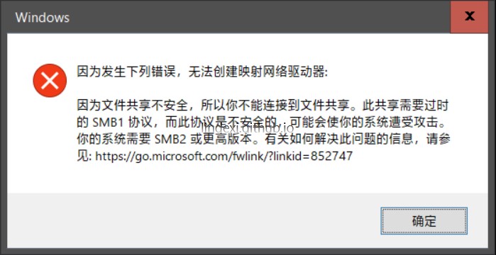共享需要过时的 SMB1 协议,而此协议是不安全的,可能会使你的系统遭受攻击。你的系统需要 SMB2 或更高版本。
