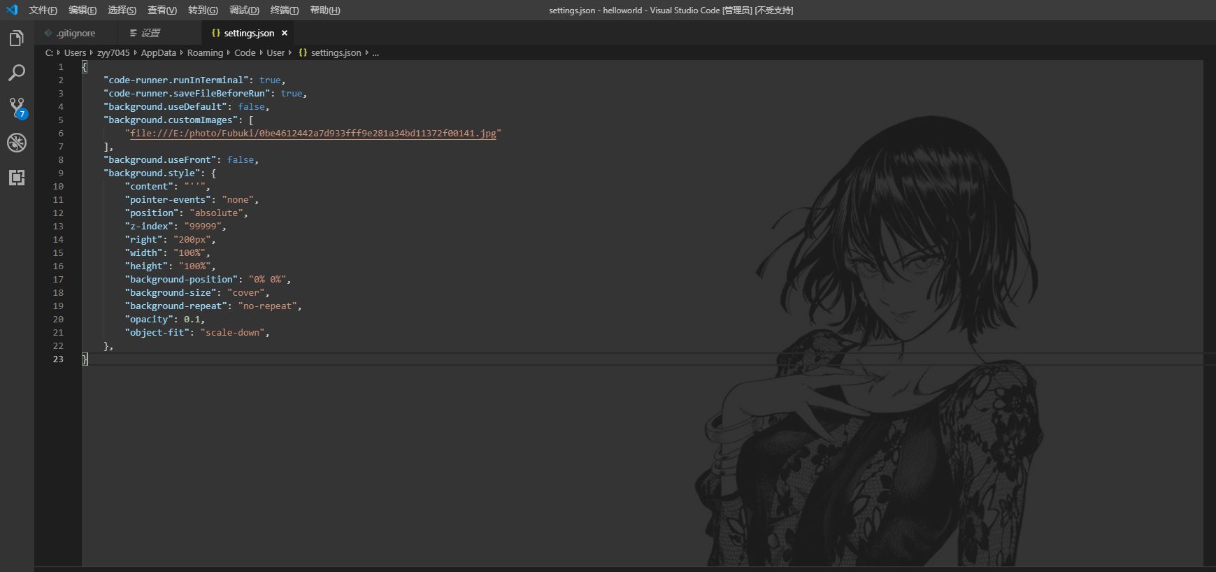 customImages也可以通过互联网获取。"background.useDefault": false, "background.customImages": [ "file:///E:/photo/Fubuki/0be4612442a7d933fff9e281a34bd11372f00141.jpg" ], "background.useFront": false, "background.style": { "content": "''", "pointer-events": "none", "position": "absolute", "z-index": "99999", "right": "200px", "width": "100%", "height": "100%", "background-position": "0% 0%", "background-size": "cover", "background-repeat": "no-repeat", "opacity": 0.1, "object-fit": "scale-down", },
