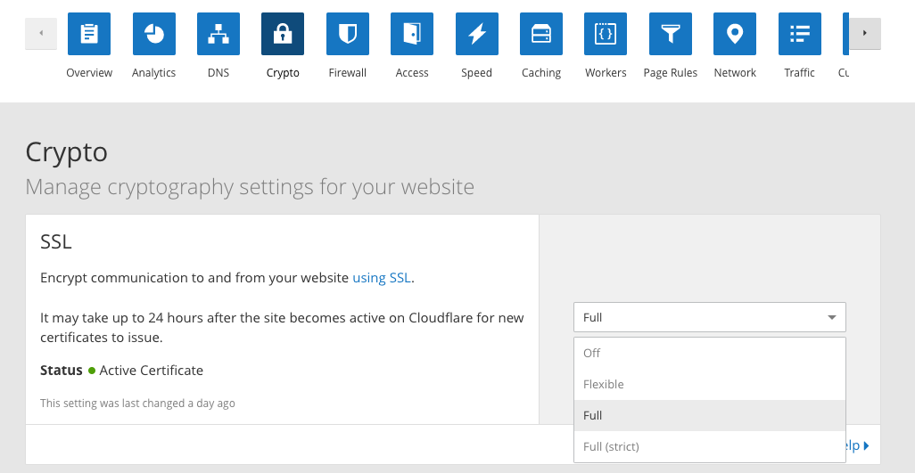 点CloudFlare Crypto页签,SSL的部分设置Off为Full或Flexible