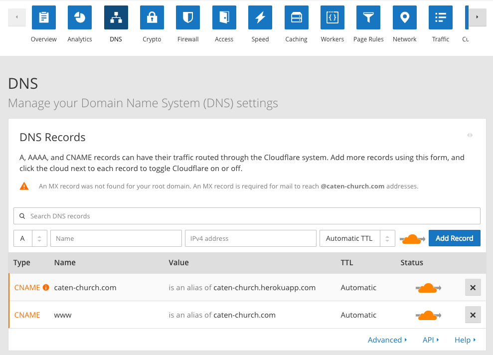 CloudFlare 刚好有提供 CNAME flattening,想要让根网域直接对应到 Heroku app,新增 CNANE,Name 填入 @,Value一样填入 Heroku 预设的网址 <app-name>.herokuapp.com。
