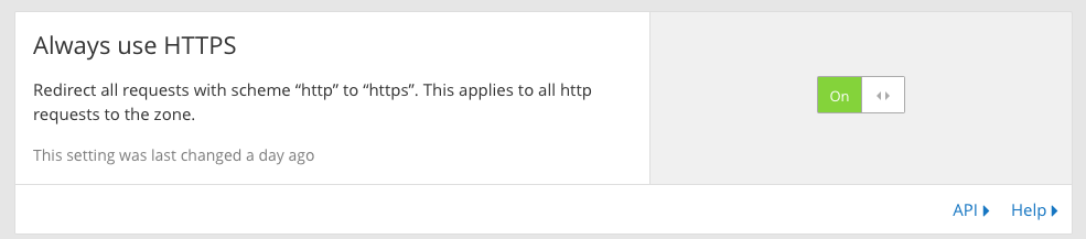 CloudFlare > Select Website > Crypto > Always use HTTPS > On