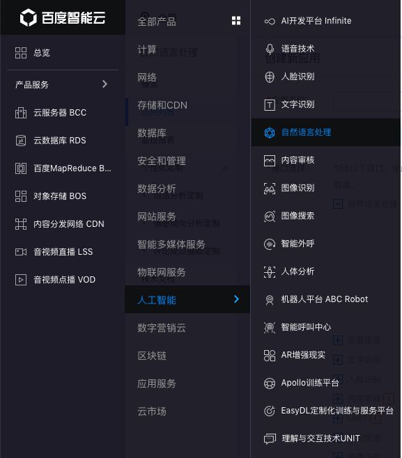 从左边的导览列选择,产品服务>人工智能>自然语言处理,可以来到自然语言处理应用程序的管理介面。