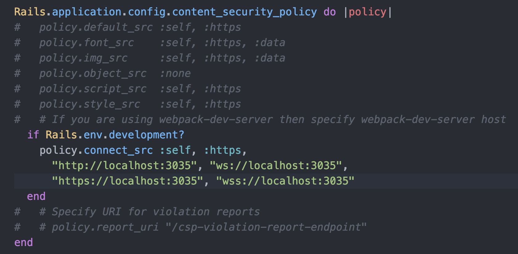 到 config/initializers/content_security_policy.rb 下添加https://localhost:3035 与 wss://localhost:3035 到 policy.connect_src 中: