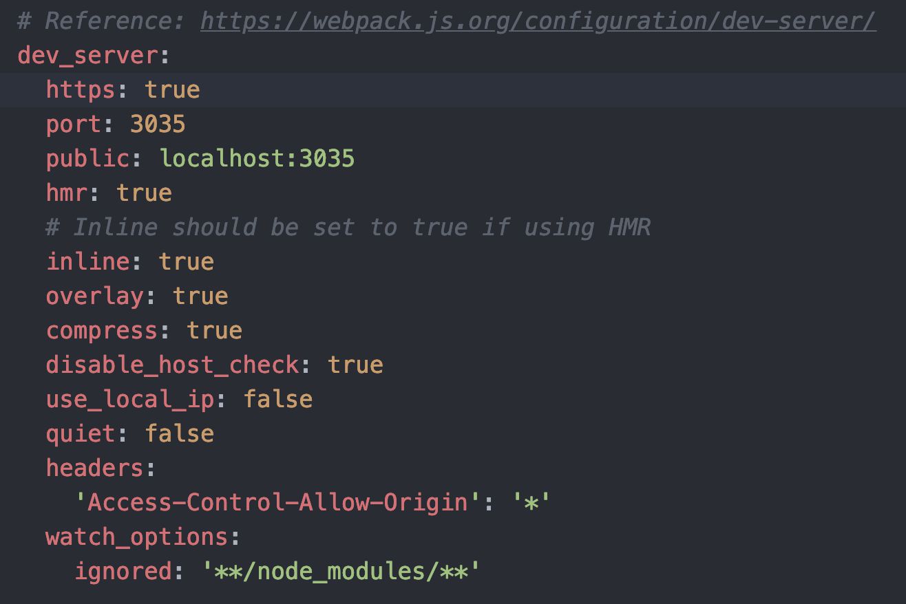 在Rails开发环境中启用HTTPS中我们将 mkcert 自签的凭证放在 config/ssl/ 下,于是我们必须修改 config/webpacker.yml 指定 development.dev_server.https.cert 与 development.dev_server.https.key 使用凭证,如下:
