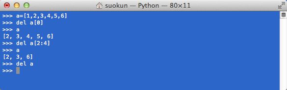 - del语句。可以用来删除每个下标,或者每一段。此外,还能删除变量。