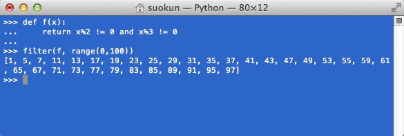 filter(函数f,序列A),返回一个区间在序列A中的,满足函数f条件的值。