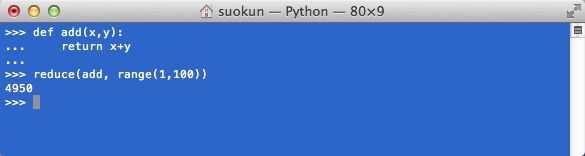 reduce(函数,序列)是进行类似累加的操作,例如相加前两项的和,然后将和与第三项相加,如此进行。【例】从1加到99: