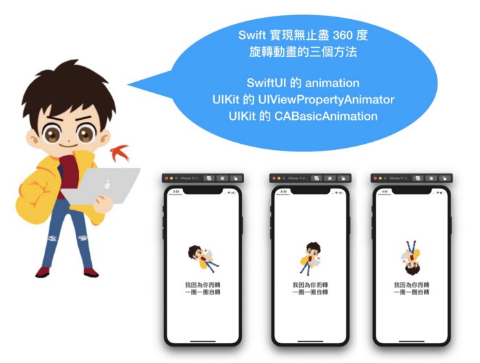 开发 iOS App 时,我们有很多方法可以实现重覆 360 度旋转的动画。接下来我们分别看看以下三种实现的方法,SwiftUI 的 animation,UIKit 的 UIViewPropertyAnimator & UIKit 的 CABasicAnimation。