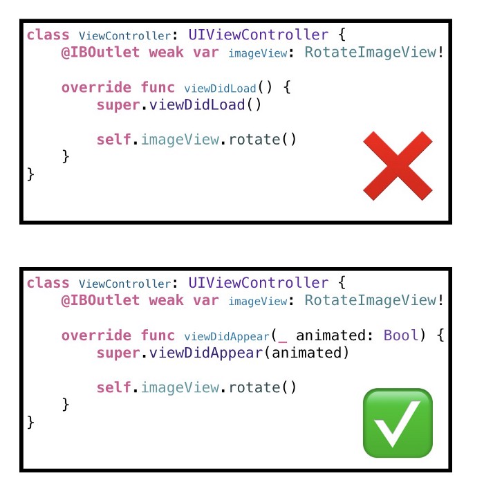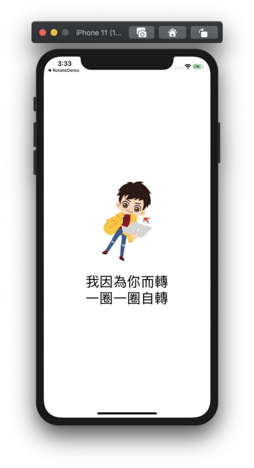 若想要画面一出现就呼叫 rotate 开始动画,记得要在 viewWillAppear 或 viewDidAppear 再加入 CABasicAnimation,在 viewDidLoad 加入的话动画将失效。