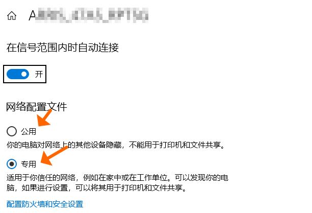 3、在「网络配置文件」下方,有公用和专用两个选项。如果是在公共场合连接的WIFI,则选择公用;如果是在家里或者信任的场合就选择专用。