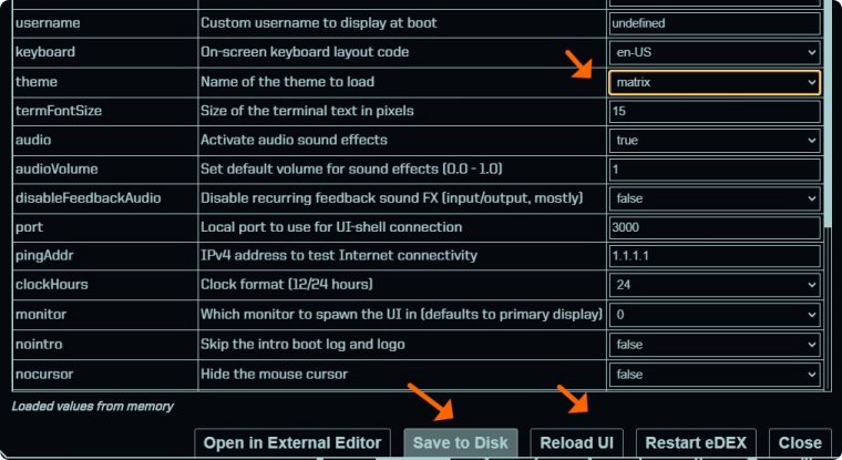 eDEX-UI支持触屏显示,包括屏幕键盘。除了还可以更换显示的主题皮肤,键盘按「Ctrl+Shift+S」进入设置界面更换显示不同的主题。