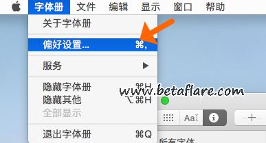 1、在「字体册」中,如果发现字体名称右侧有黄色符号⚠️,说明字体安装重复了。依次打开顶部菜单栏的字体册的偏好设置。