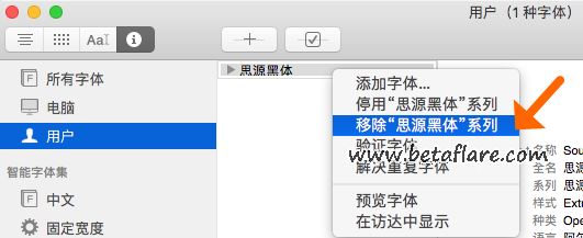 比如上文中的「思源黑体」以后再也用不到了。在「字体册」中右键「思源黑体」,选择移除“思源黑体”系列。