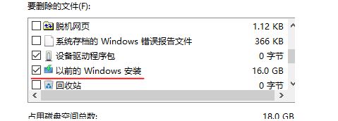 4、在「要删除的文件」框里,勾选“以前的 Windows 安装”。