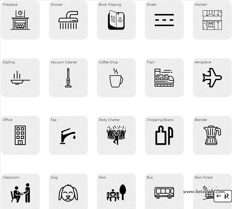 Fireplace(壁炉)、Shower(淋浴)、Book Flipping(翻书)、Street(街道)、Kitchen(厨房)、Sizzling(烧烤)、Vacuum Cleaner(吸尘器)、Coffee Shop(咖啡店)、Train(火车)、Aeroplane(飞机)、Office(办公室)、Tap(水龙头)、Party Chatter(聚会聊天)、Chopping Board(劈柴板)、Blender(搅拌机)、Classroom(教室)、Dog(狗狗)、Park(公园)、Bus(公交车)、Rain Forest(雨林)