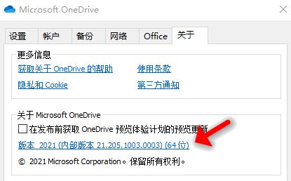 点击 “关于 “标签,在“关于Microsft OneDrive”这一栏可以看到“版本2021(内部版本21.205,1003.0003)(64位)”。