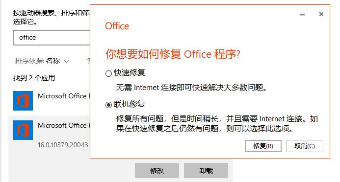 由于OneDrive是微软Office软件包的一部分,任何影响Office安装文件的问题也会影响OneDrive,可以修复Office以解决OneDrive问题。